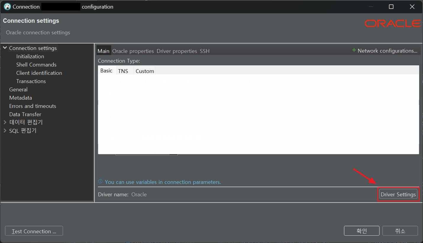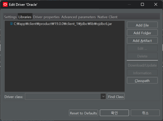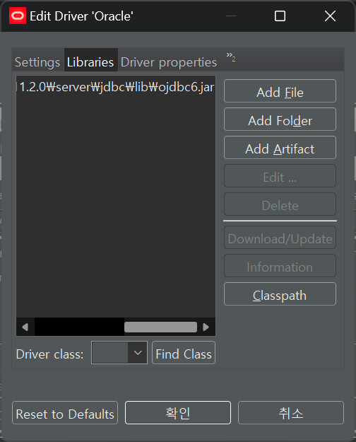 연결 접속 셋팅에 Driver Settings 버튼을 클릭한 후 Libraries 탭으로 이동한다.