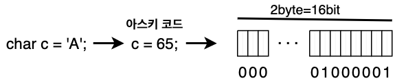 문자코드는 음수를 사용할 필요가 없기 때문에 char의 범위에는 부호가 없음