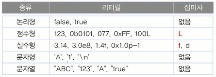 - long : 구분을 위해 리터럴 마지막에 접미사로 L을 붙임 ex) 100L