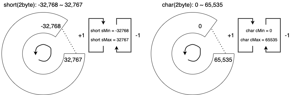 정수형은 해당 변수타입의 최솟값, 최댓값 범위를 넘어가면 값을 순환